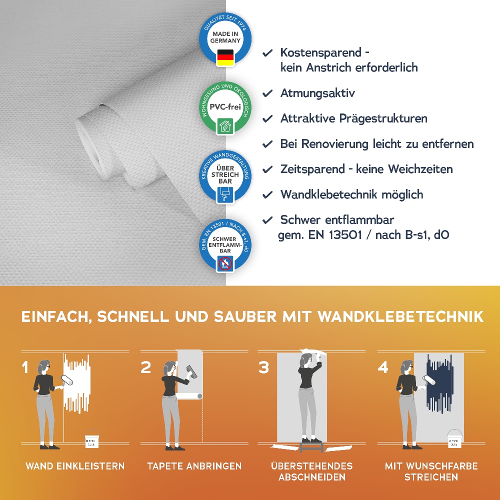 Alle wichtigen Informationen finden Sie auch auf dem Beipackzettel jeder Tapetenrolle.