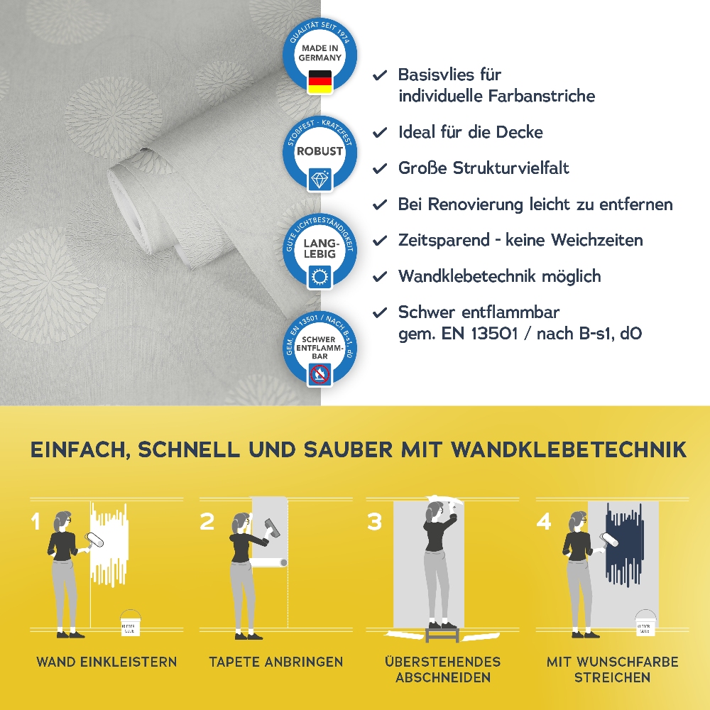 Alle wichtigen Informationen finden Sie auch auf dem Beipackzettel jeder Tapetenrolle.