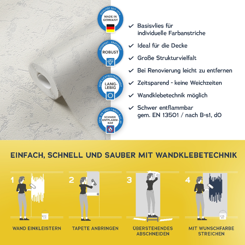 Das Überstreichbare Glattvlies von A.S. Création ist ein hochwertiges Produkt in verschiedenen Grammaturen. Das Renovierungsvlies kann in sämtlichen Räumen verarbeitet werden, solange eine angemessene Vorarbeit des Untergrundes stattgefunden hat. Durch glatte Wände erhalten Sie eine stilvolle und moderne Lösung für Ihre Wohn- oder Gewerberäume. Die Tapete ist rissüberbrückend und kann mehrfach überstrichen werden.